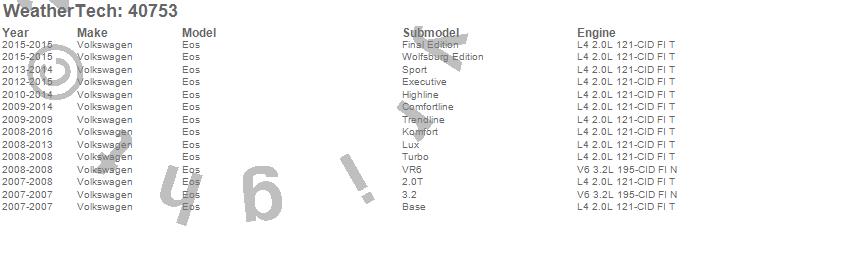 Below is an abbreviated list of applications for the Cargo Liner.Eos, Volkswagen, 2016, 2015, 2014, 2013, 2012, 2011, 2010, 2009, 2008, 2007
