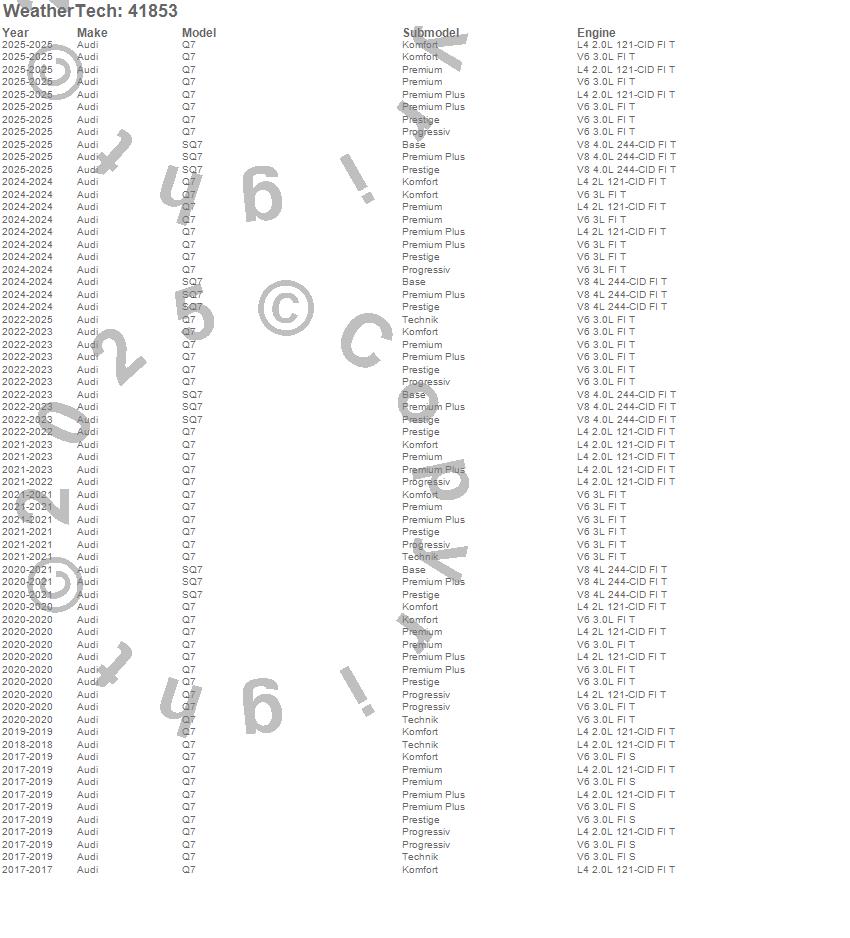 Below is an abbreviated list of applications for the Cargo Liner.Q7, SQ7, Audi, 2026, 2025, 2024, 2023, 2022, 2021, 2020, 2019, 2018, 2017