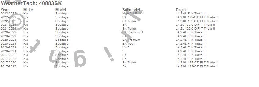 Below is an abbreviated list of applications for the Cargo Liner w/Bumper Protector.Sportage, Kia, 2022, 2021, 2020, 2019, 2018, 2017