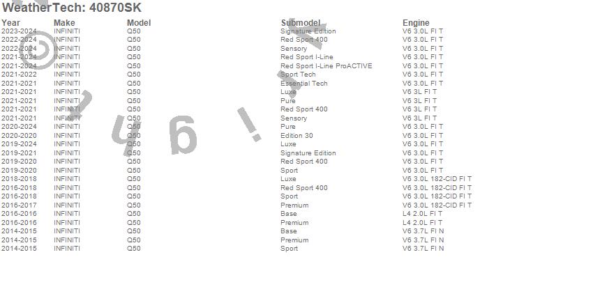 Below is an abbreviated list of applications for the Cargo Liner w/Bumper Protector.Q50, INFINITI, 2024, 2023, 2022, 2021, 2020, 2019, 2018, 2017, 2016, 2015, 2014