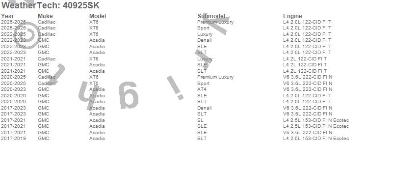 Below is an abbreviated list of applications for the Cargo Liner w/Bumper Protector.Acadia, XT6, Cadillac, GMC, 2025, 2024, 2023, 2022, 2021, 2020, 2019, 2018, 2017