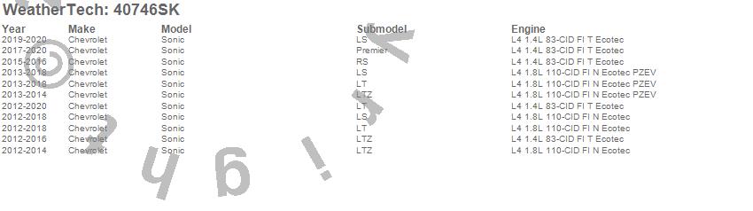 Below is an abbreviated list of applications for the Cargo Liner w/Bumper Protector.Sonic, Chevrolet, 2020, 2019, 2018, 2017, 2016, 2015, 2014, 2013, 2012