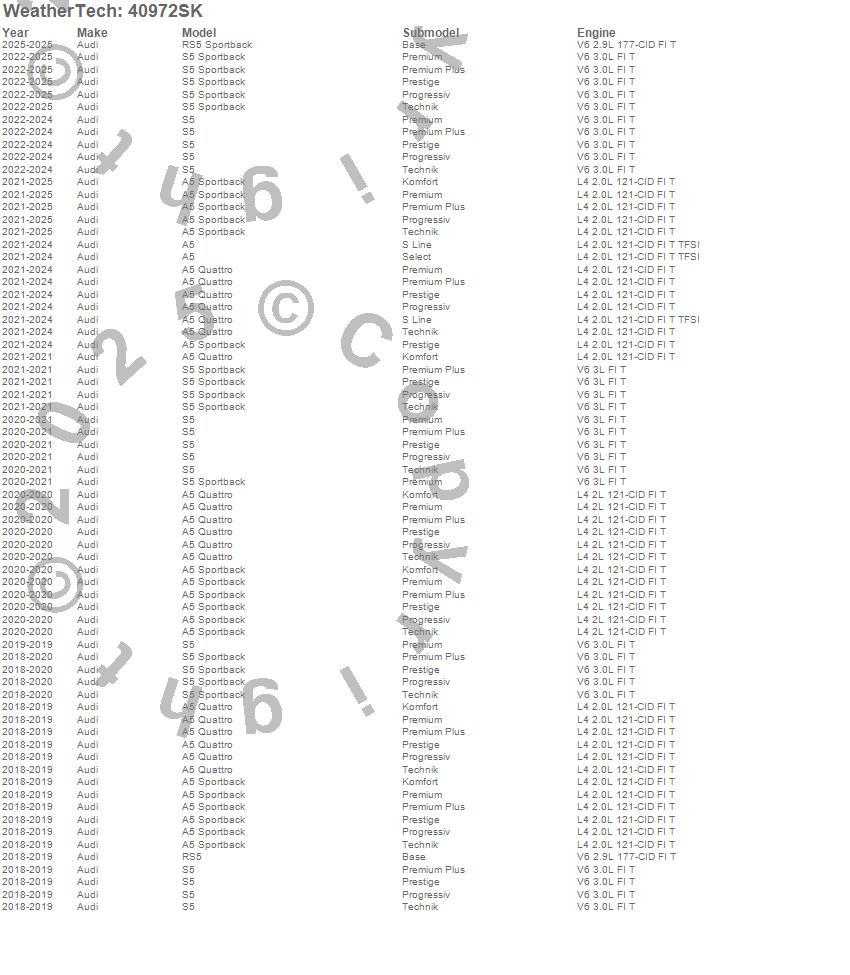 Below is an abbreviated list of applications for the Cargo Liner w/Bumper Protector.A5, A5 Quattro, A5 Sportback, RS5, RS5 Sportback, S5, S5 Sportback, Audi, 2025, 2024, 2023, 2022, 2021, 2020, 2019, 2018