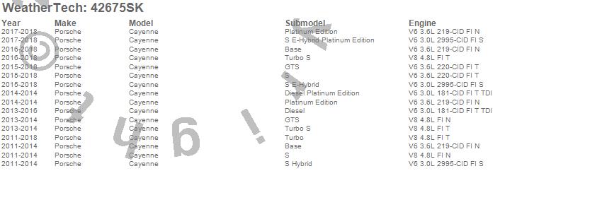 Below is an abbreviated list of applications for the Cargo Liner w/Bumper Protector.Cayenne, Porsche, 2018, 2017, 2016, 2015, 2014, 2013, 2012, 2011