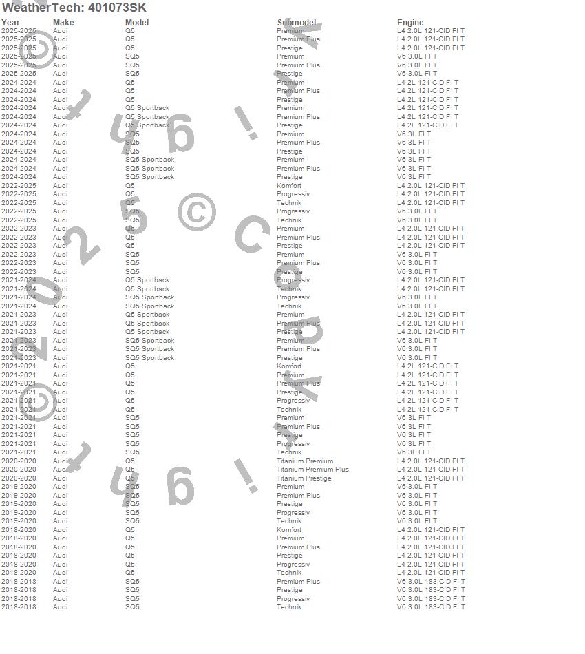 Below is an abbreviated list of applications for the Cargo Liner w/Bumper Protector.Q5, Q5 Sportback, SQ5, SQ5 Sportback, Audi, 2025, 2024, 2023, 2022, 2021, 2020, 2019, 2018