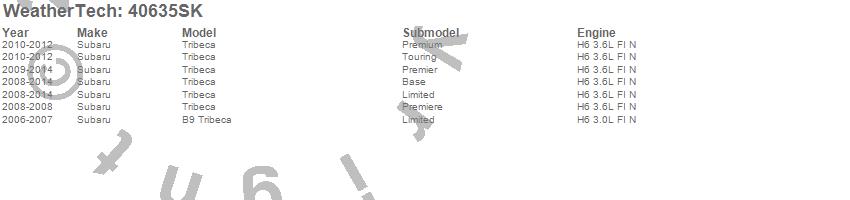 Below is an abbreviated list of applications for the Cargo Liner w/Bumper Protector.B9 Tribeca, Tribeca, Subaru, 2014, 2013, 2012, 2011, 2010, 2009, 2008, 2007, 2006