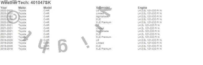 Below is an abbreviated list of applications for the Cargo Liner w/Bumper Protector.C-HR, Toyota, 2022, 2021, 2020, 2019, 2018