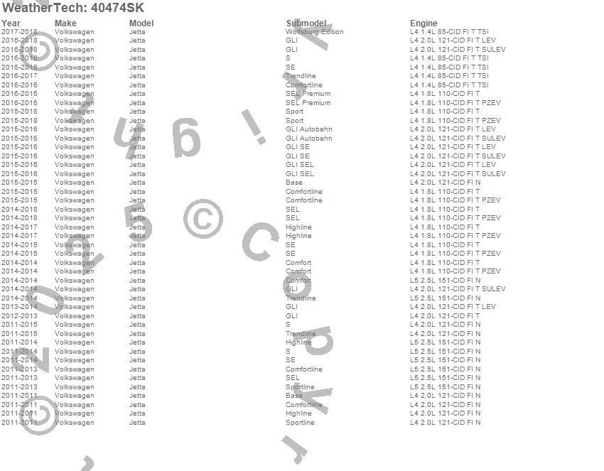 Below is an abbreviated list of applications for the Cargo Liner w/Bumper Protector.Jetta, Volkswagen, 2018, 2017, 2016, 2015, 2014, 2013, 2012, 2011