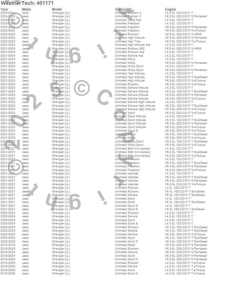 Below is an abbreviated list of applications for the Cargo Liner.Wrangler (JL), Jeep, 2024, 2023, 2022, 2021, 2020, 2019, 2018