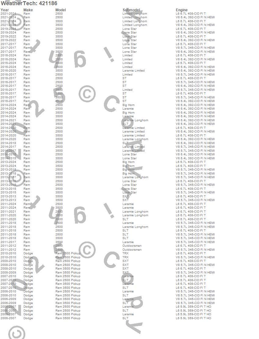 Below is an abbreviated list of applications for the Cargo Liner.2500, 3500, Ram 2500, Ram 3500, Dodge, Ram, 2024, 2023, 2022, 2021, 2020, 2019, 2018, 2017, 2016, 2015, 2014, 2013, 2012, 2011