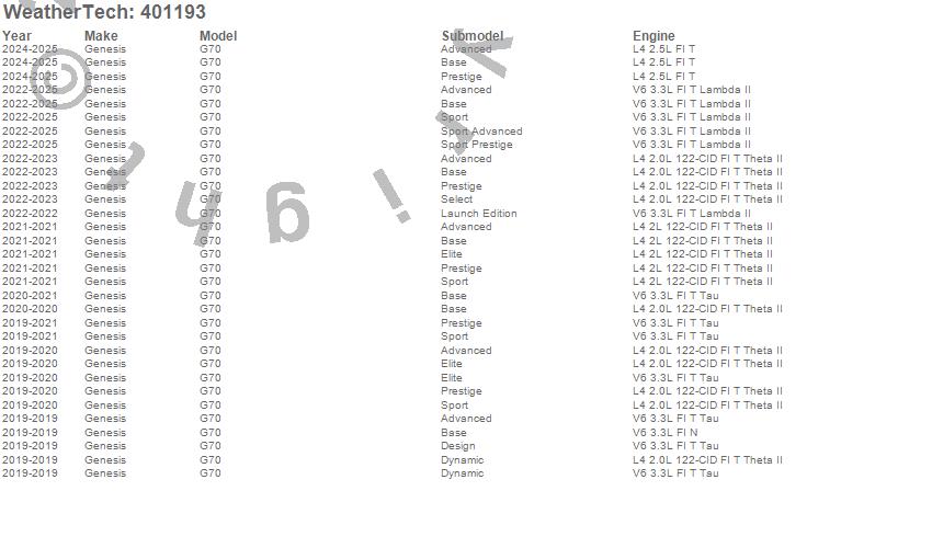 Below is an abbreviated list of applications for the Cargo Liner.G70, Genesis, 2026, 2025, 2024, 2023, 2022, 2021, 2020, 2019