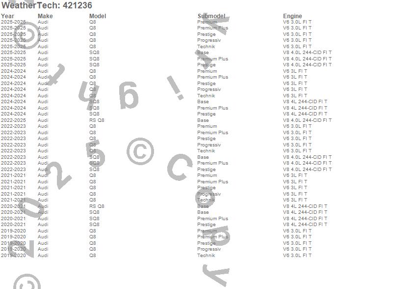 Below is an abbreviated list of applications for the Cargo Liner.Q8, RS Q8, SQ8, Audi, 2026, 2025, 2024, 2023, 2022, 2021, 2020, 2019