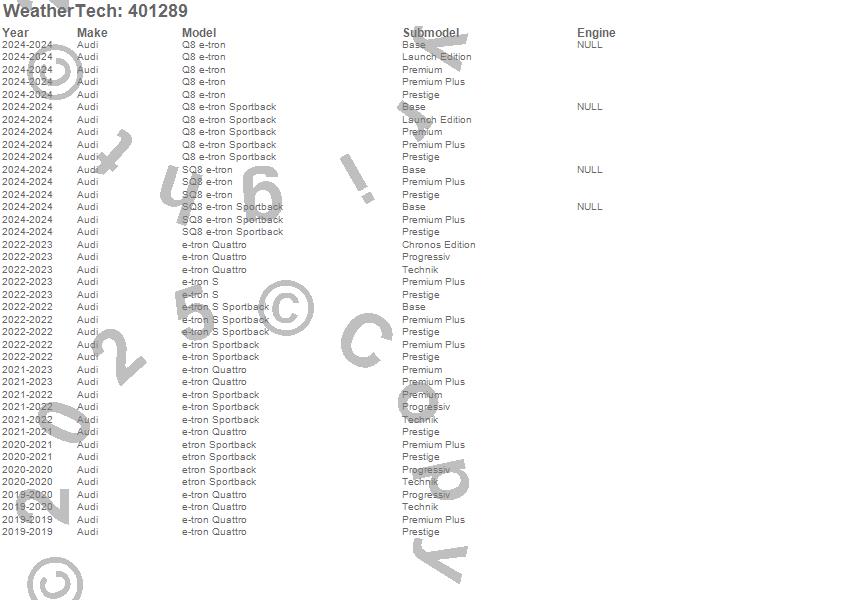 Below is an abbreviated list of applications for the Cargo Liner.e-tron Quattro, e-tron S, e-tron S Sportback, e-tron Sportback, etron Sportback, Q8 e-tron, Q8 e-tron Sportback, SQ8 e-tron, SQ8 e-tron Sportback, Audi, 2024, 2023, 2022, 2021, 2020, 2019