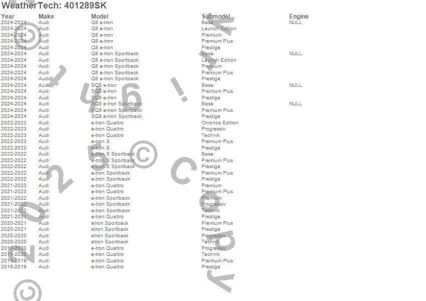 Below is an abbreviated list of applications for the Cargo Liner w/Bumper Protector.e-tron Quattro, e-tron S, e-tron S Sportback, e-tron Sportback, etron Sportback, Q8 e-tron, Q8 e-tron Sportback, SQ8 e-tron, SQ8 e-tron Sportback, Audi, 2024, 2023, 2022, 2021, 2020, 2019