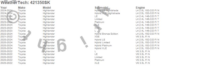 Below is an abbreviated list of applications for the Cargo Liner w/Bumper Protector.Highlander, Toyota, 2025, 2024, 2023, 2022, 2021, 2020