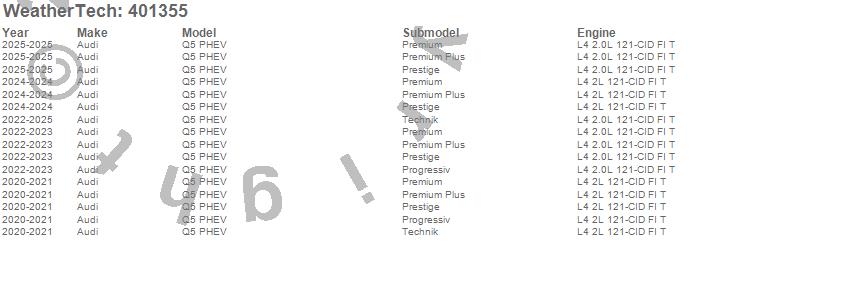 Below is an abbreviated list of applications for the Cargo Liner.Q5 PHEV, Audi, 2025, 2024, 2023, 2022, 2021, 2020