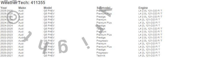 Below is an abbreviated list of applications for the Cargo Liner.Q5 PHEV, Audi, 2025, 2024, 2023, 2022, 2021, 2020