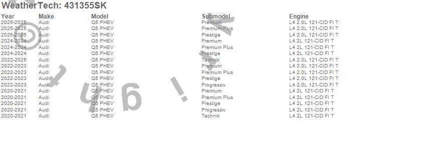 Below is an abbreviated list of applications for the Cargo Liner w/Bumper Protector.Q5 PHEV, Audi, 2025, 2024, 2023, 2022, 2021, 2020