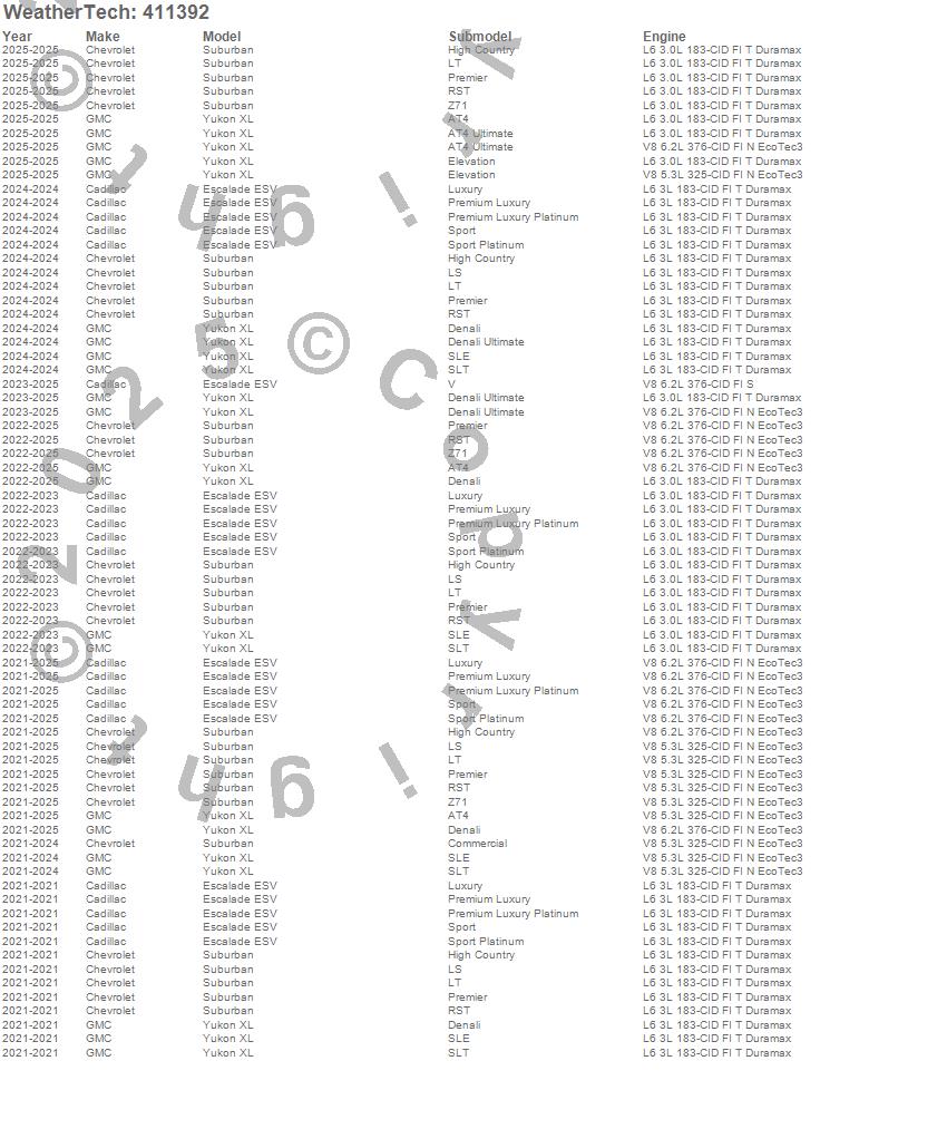 Below is an abbreviated list of applications for the Cargo Liner.Escalade ESV, Suburban, Yukon XL, Cadillac, Chevrolet, GMC, 2026, 2025, 2024, 2023, 2022, 2021