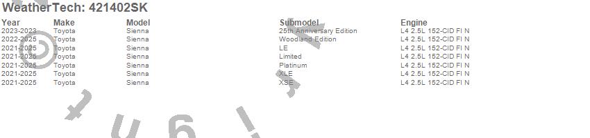 Below is an abbreviated list of applications for the Cargo Liner w/Bumper Protector.Sienna, Toyota, 2026, 2025, 2024, 2023, 2022, 2021