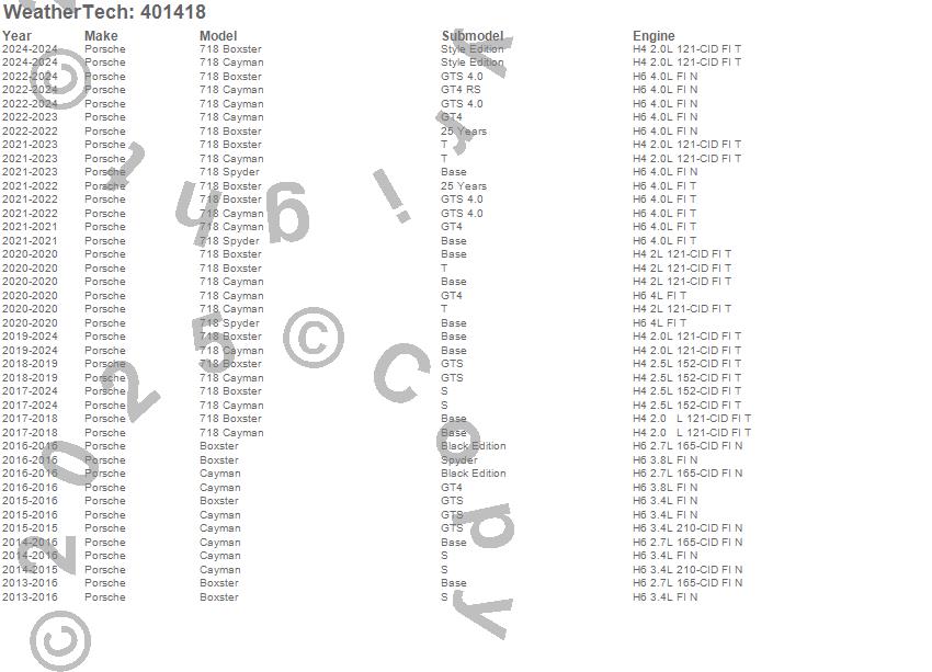 Below is an abbreviated list of applications for the Cargo Liner.718 Boxster, 718 Cayman, 718 Spyder, Boxster, Cayman, Porsche, 2025, 2024, 2023, 2022, 2021, 2020, 2019, 2018, 2017, 2016, 2015, 2014, 2013