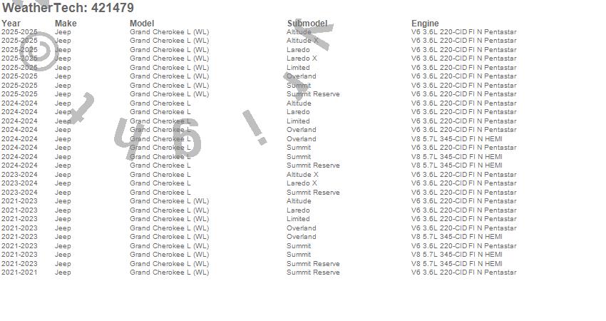 Below is an abbreviated list of applications for the Cargo Liner.Grand Cherokee L, Grand Cherokee L (WL), Jeep, 2025, 2024, 2023, 2022, 2021