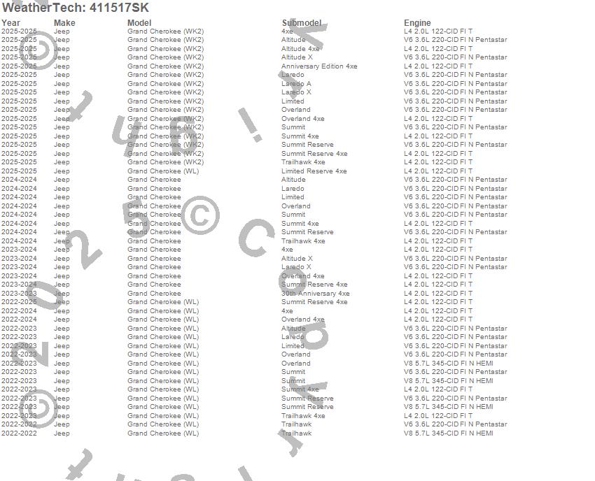 Below is an abbreviated list of applications for the Cargo Liner w/Bumper Protector.Grand Cherokee, Grand Cherokee (WK2), Grand Cherokee (WL), Jeep, 2025, 2024, 2023, 2022