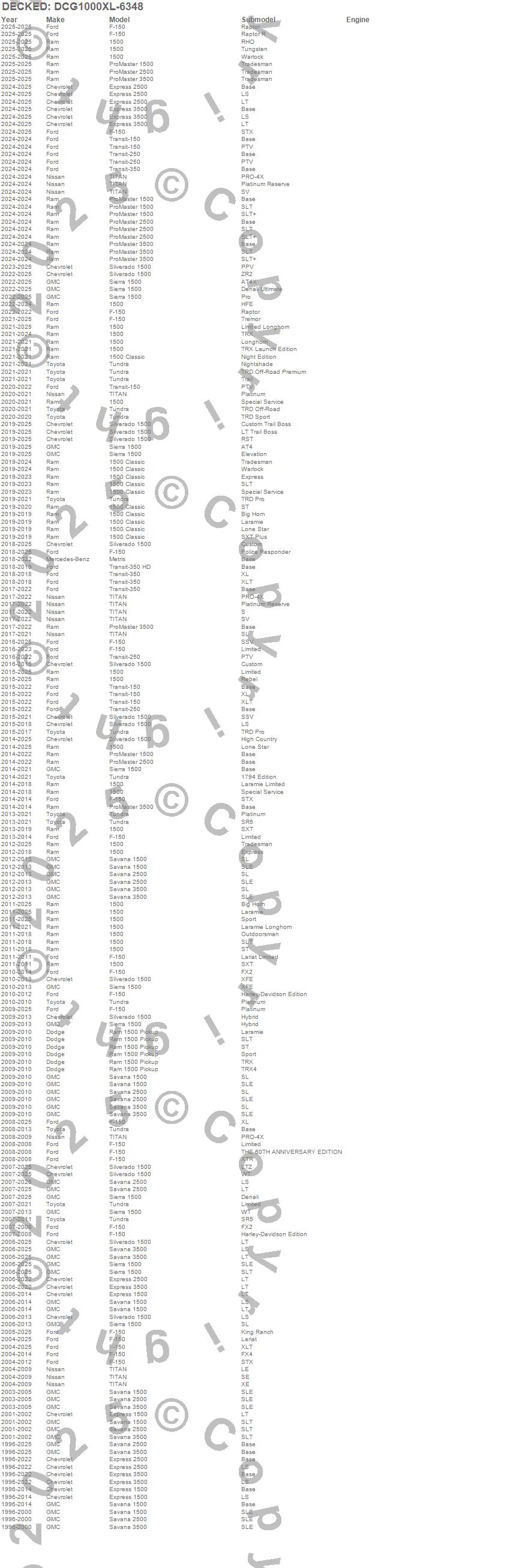 Brand: DECKEDPart Number: DCG1000XL-6348Rollout Cargo Bed Type: 63 x 48 in. - 100 Percent Extension - 1000 lbs. CapacityUPC: 815294024744
