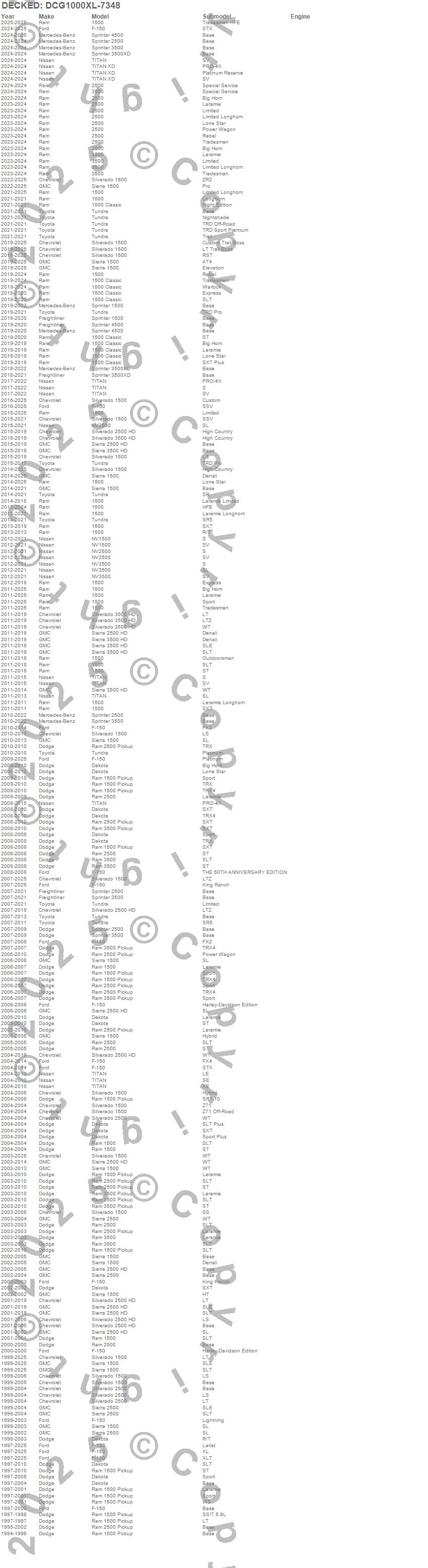 Brand: DECKEDPart Number: DCG1000XL-7348Rollout Cargo Bed Type: 73 x 48 in. - 100 Percent Extension - 1000 lbs. CapacityUPC: 815294024751