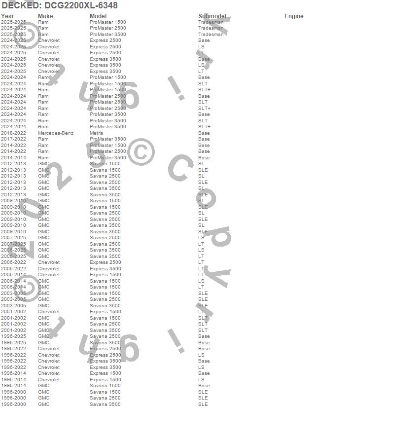 Brand: DECKEDPart Number: DCG2200XL-6348Rollout Cargo Bed Type: 63 in. x 48 in. - 100 Percent Extension - 2200 lbs. CapacityUPC: 815294024829