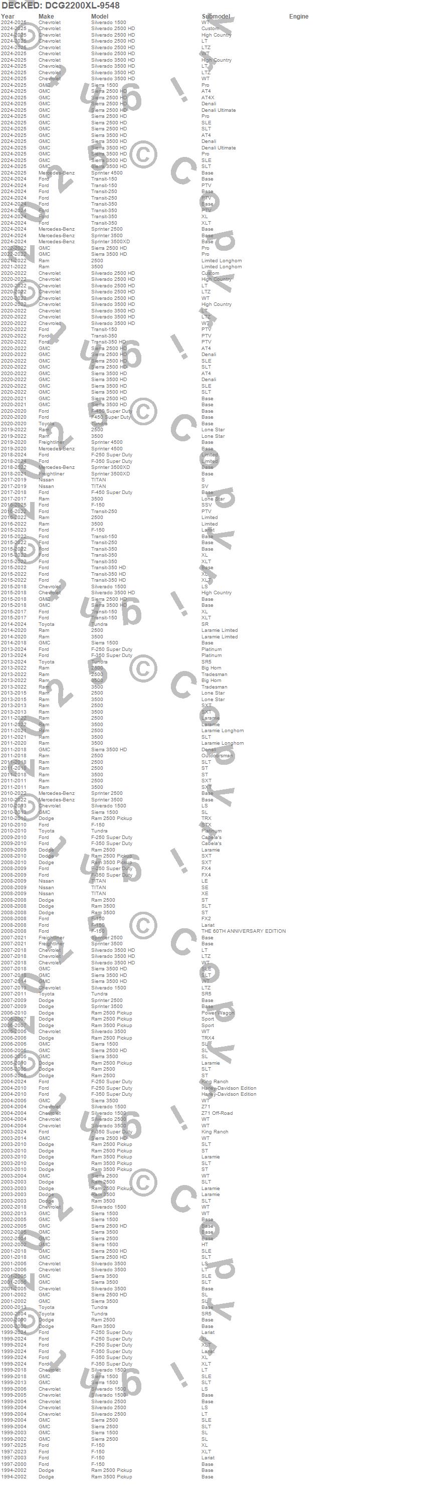 Brand: DECKEDPart Number: DCG2200XL-9548Rollout Cargo Bed Type: 95 in. x 48 in. - 100 Percent Extension - 2200 lbs. CapacityUPC: 815294024867