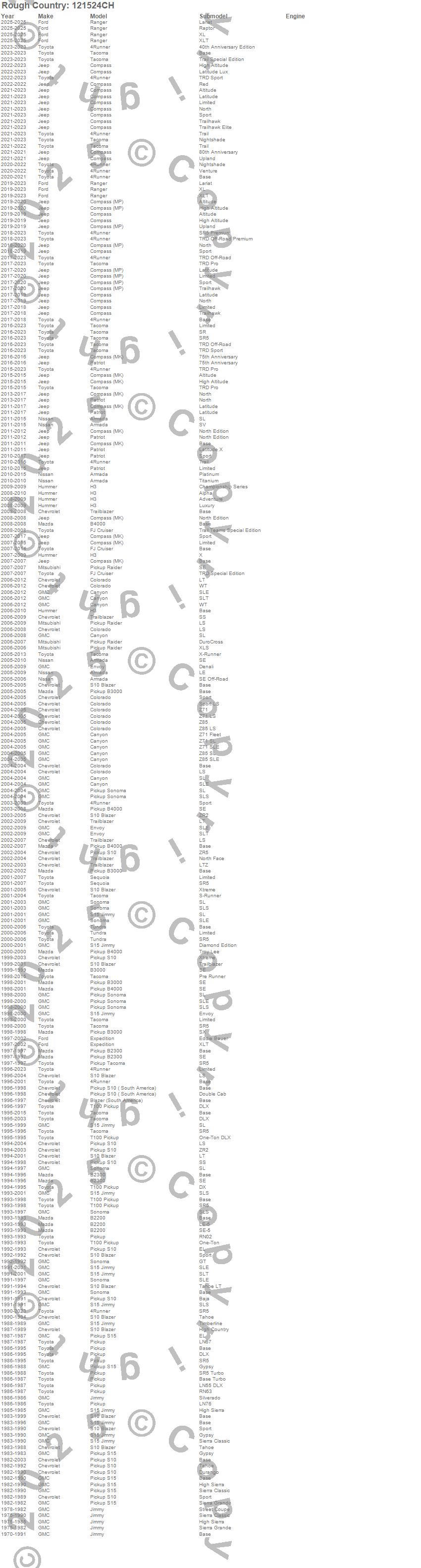 Below is an abbreviated list of applications for the Wheel Installation Kit.4Runner, Armada, B2200, B2300, B3000, B4000, Blazer (South America), Bronco, Canyon, Colorado, Compass, Envoy, Expedition, FJ Cruiser, H3, Jimmy, Patriot, Pickup, Raider, Ranger