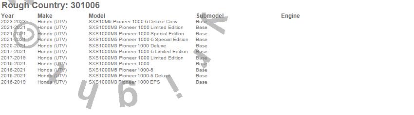 Brand: Rough CountryPart Number: 301006Coil Over Shock Absorber Type: 0-2 in. Lift - RearUPC: 840269903250