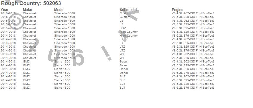 Below is an abbreviated list of applications for the Leveling Strut Kit.Sierra 1500, Silverado 1500, Chevrolet, GMC, 2018, 2017, 2016, 2015, 2014
