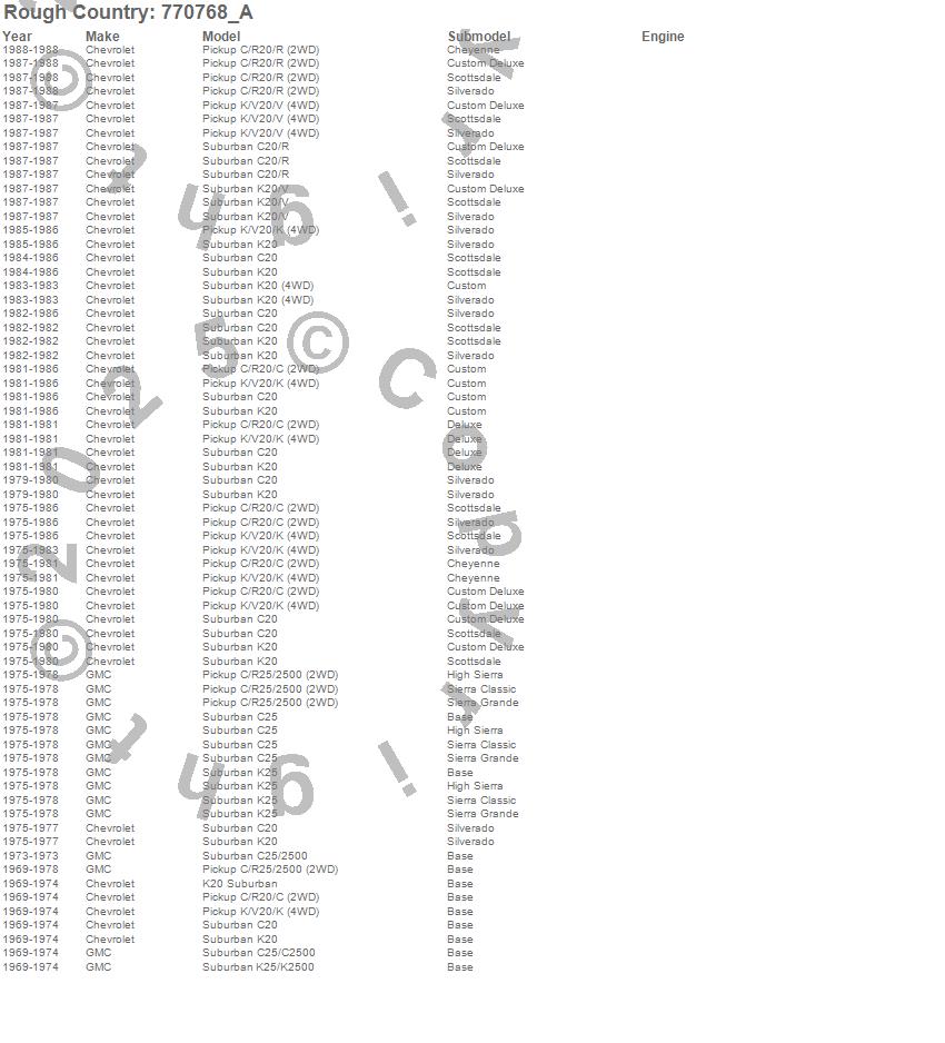 Below is an abbreviated list of applications for the M1 Shock Absorber.C20 Pickup, C20 Suburban, C25 Suburban, C25/C2500 Pickup, C25/C2500 Suburban, K20 Pickup, K20 Suburban, K25 Suburban, K25/K2500 Suburban, R20 Pickup, R20 Suburban, V20 Pickup, V20 Suburban, Chevrolet, GMC, 1988, 1987, 1986, 1985, 1984