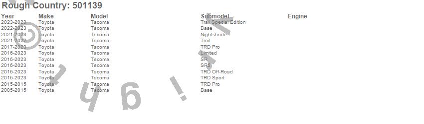 Brand: Rough CountryPart Number: 501139Suspension Strut Assembly Type: 3 in. Lift - Loaded - PairUPC: 840269900075