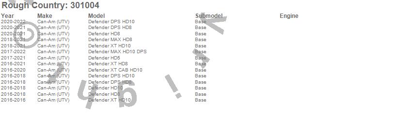 Brand: Rough CountryPart Number: 301004Coil Over Shock Absorber Type: 0-2 in. Lift - RearUPC: 840269903236