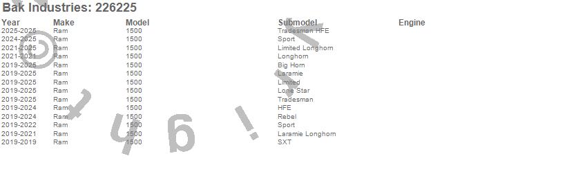 Brand: BAK IndustriesPart Number: 226225Tonneau Cover Type: Black - Aluminum - Gloss Black FinishUPC: 192631034483
