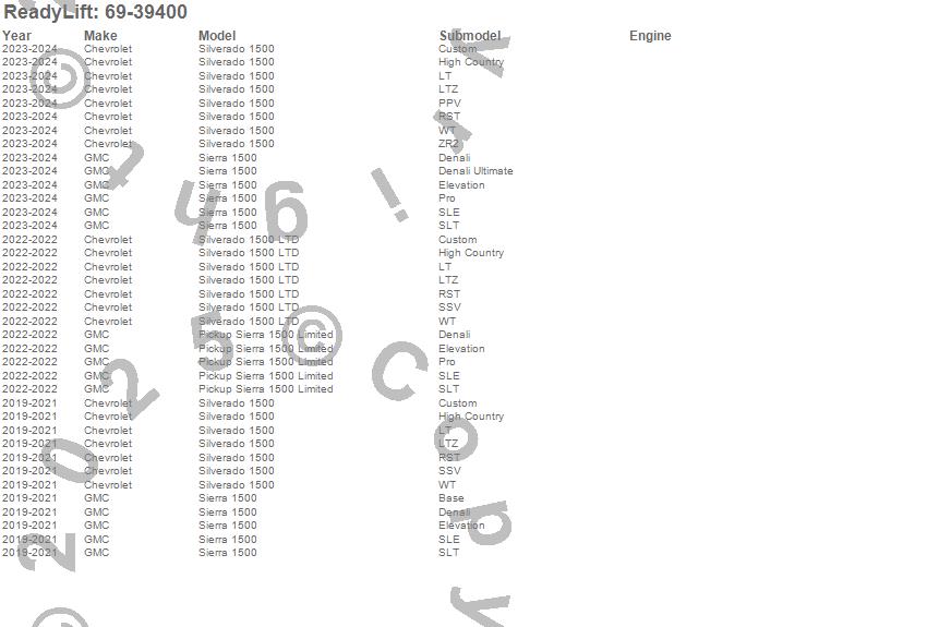 Below is an abbreviated list of applications for the SST Lift Kit.Pickup Sierra 1500 Limited, Sierra 1500, Silverado 1500, Silverado 1500 LTD, Chevrolet, GMC, 2024, 2023, 2022, 2021, 2020, 2019