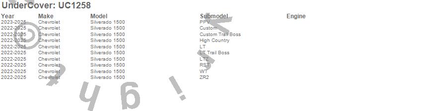 Brand: UnderCoverPart Number: UC1258Tonneau Cover Type: Black Textured - w/ Multi Flex TGUPC: 840114322779