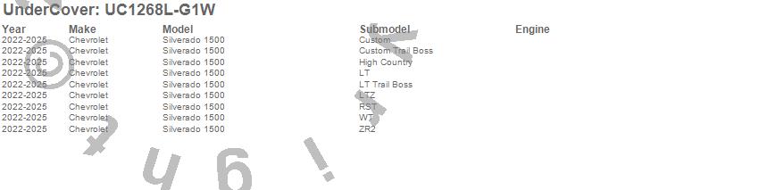 Brand: UnderCoverPart Number: UC1268L-G1WTonneau Cover Type: Iridescent Pearl Tricoat - w/ Multi Flex TG - Paint Code G1WUPC: 840114322755