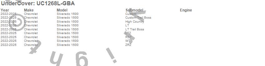 Brand: UnderCoverPart Number: UC1268L-GBATonneau Cover Type: Black - w/ Multi Flex TG - Paint Code 41UPC: 840114322731
