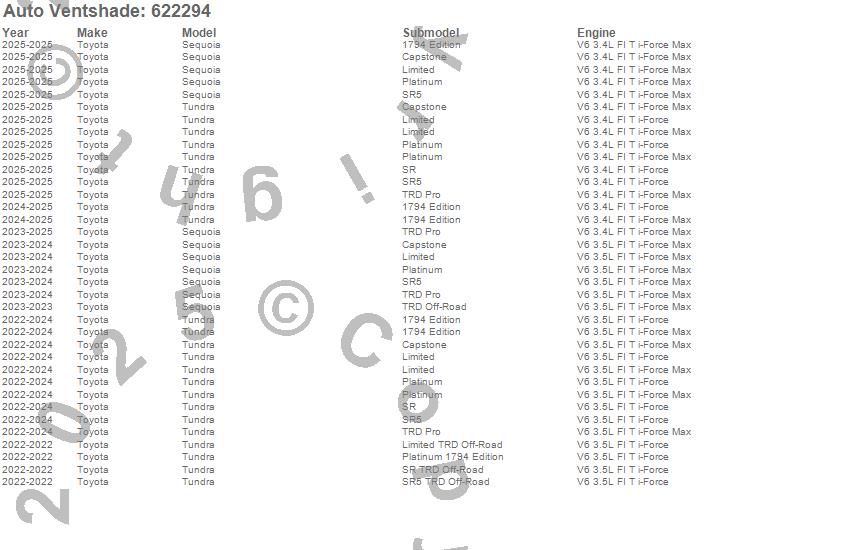 Below is an abbreviated list of applications for the Aeroskin Chrome Hood Protector.Sequoia, Tundra, Toyota, 2025, 2024, 2023, 2022