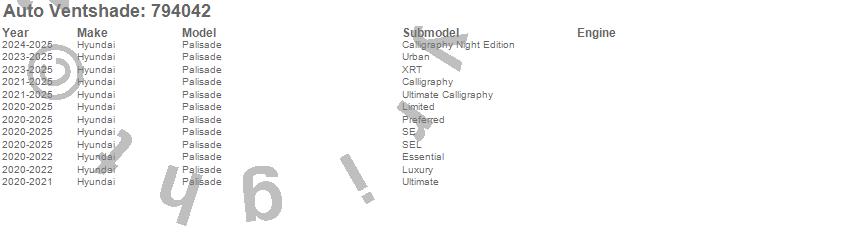 Below is an abbreviated list of applications for the Ventvisor Low Profile Deflector 4 pc..Palisade, Hyundai, 2025, 2024, 2023, 2022, 2021, 2020