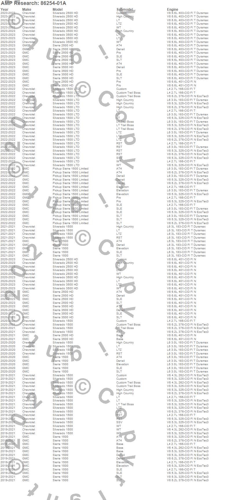 Below is an abbreviated list of applications for the PowerStep Smart Series.Pickup Sierra 1500 Limited, Sierra 1500, Sierra 2500 HD, Sierra 3500 HD, Silverado 1500, Silverado 1500 LTD, Silverado 2500 HD, Silverado 3500 HD, Chevrolet, GMC, 2023, 2022, 2021, 2020, 2019