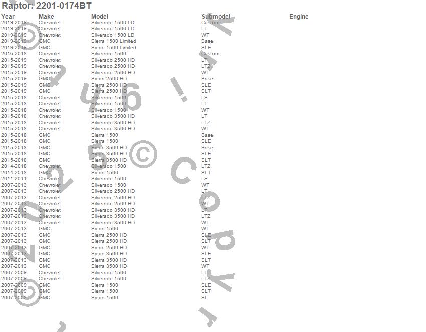 Brand: RaptorPart Number: 2201-0174BTRunning Board Type: Black Textured - Rocker Panel MountUPC: 810075530650