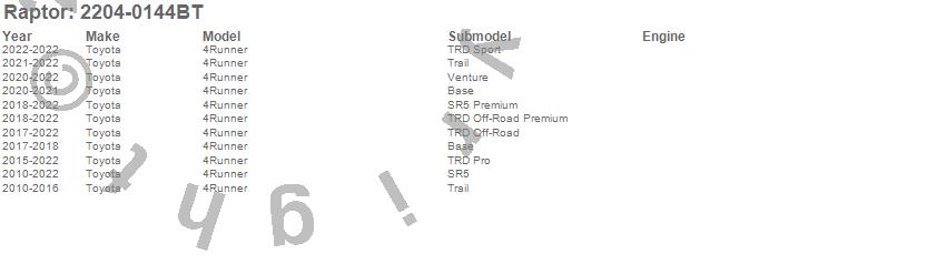 Brand: RaptorPart Number: 2204-0144BTRunning Board Type: Black Textured - Rocker Panel MountUPC: 810075531312