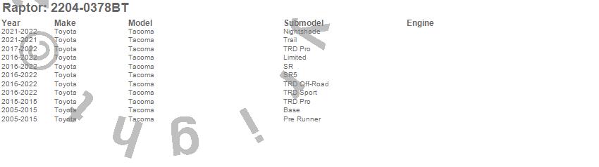 Brand: RaptorPart Number: 2204-0378BTRunning Board Type: Black Textured - Rocker Panel MountUPC: 810075530810