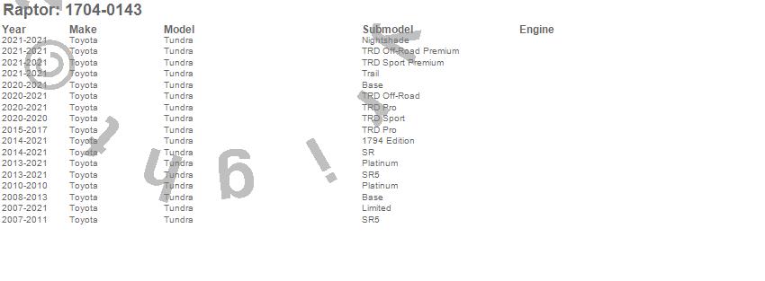 Below is an abbreviated list of applications for the OEM Running Boards.Tundra, Toyota, 2021, 2020, 2019, 2018, 2017, 2016, 2015, 2014, 2013, 2012, 2011, 2010, 2009, 2008, 2007