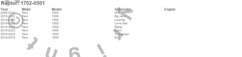 Brand: RaptorPart Number: 1702-0501Running Board Type: 6 in. - Rocker Panel Mount - AluminumUPC: 813443023488